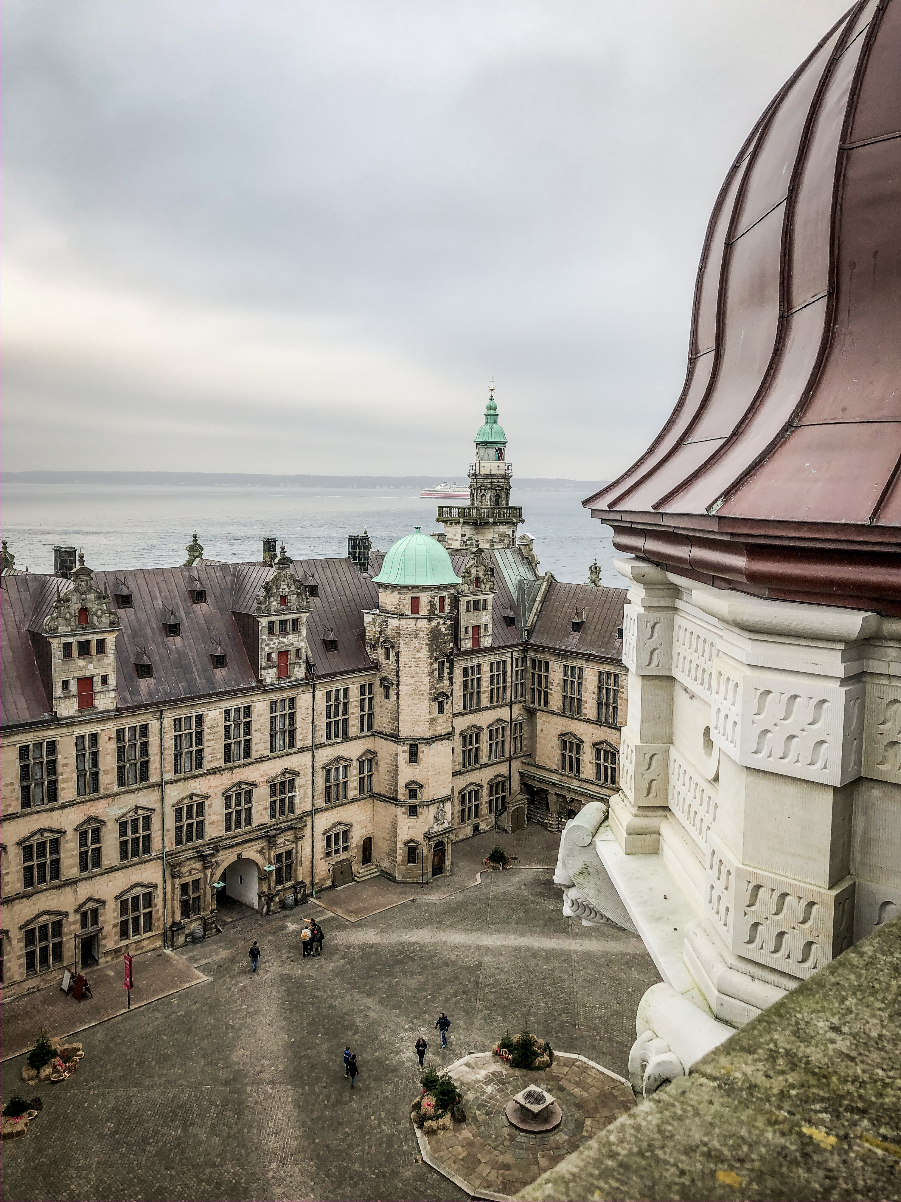 Voilà donc une jolie petite ville portuaire. Quelques gros bateaux traversent sans cesse le détroit et le château se dresse fièrement au bord de l’eau. Ce château, c’est celui de Kronborg, autrement dit celui d’Hamlet. Une visite s’impose et le plus bluffant reste évidemment la vue depuis la tour de garde.