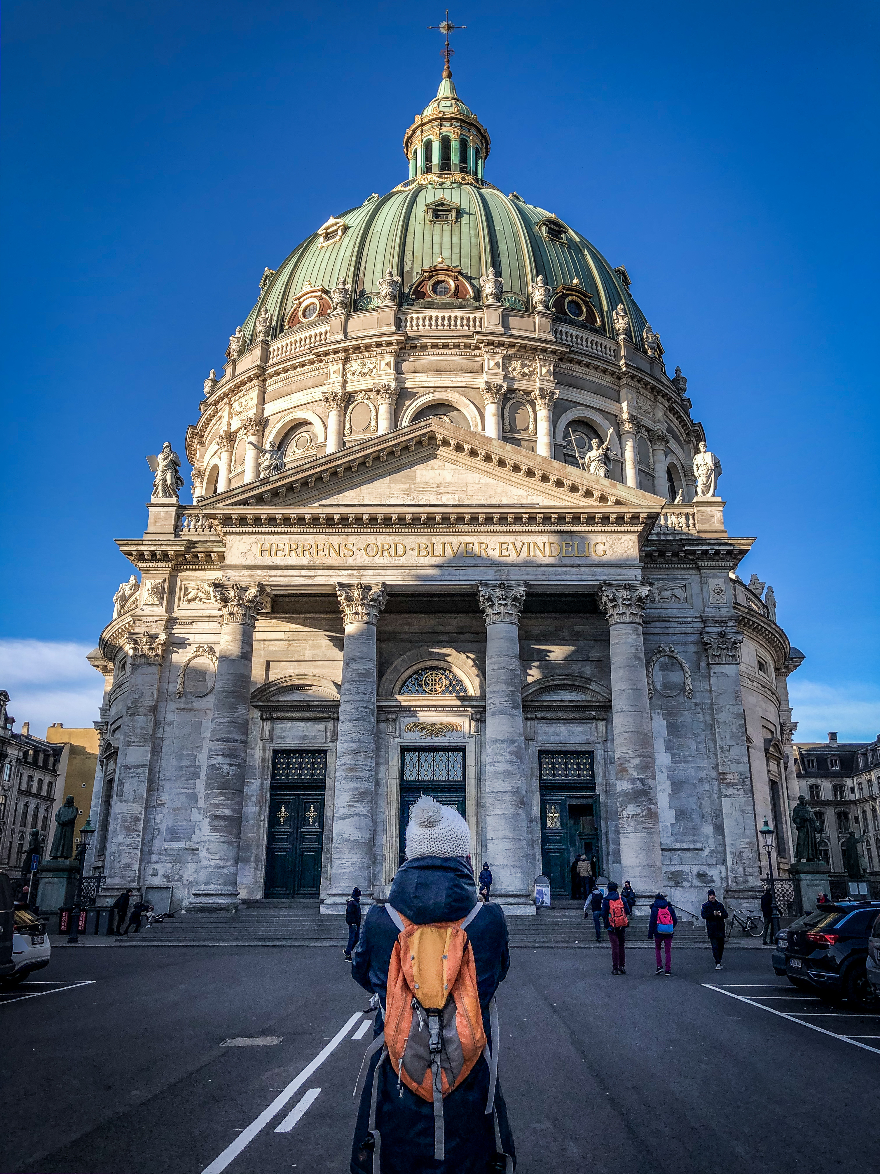Deux rues plus loin, nous quittons l’architecture contemporaine pour revenir à quelque chose de plus classique, mais tout aussi classe. Pile à l’heure pour la relève de la garde à Amalienborg, la résidence d’hiver de la reine juste en face de l’imposante église Marmorkirken !