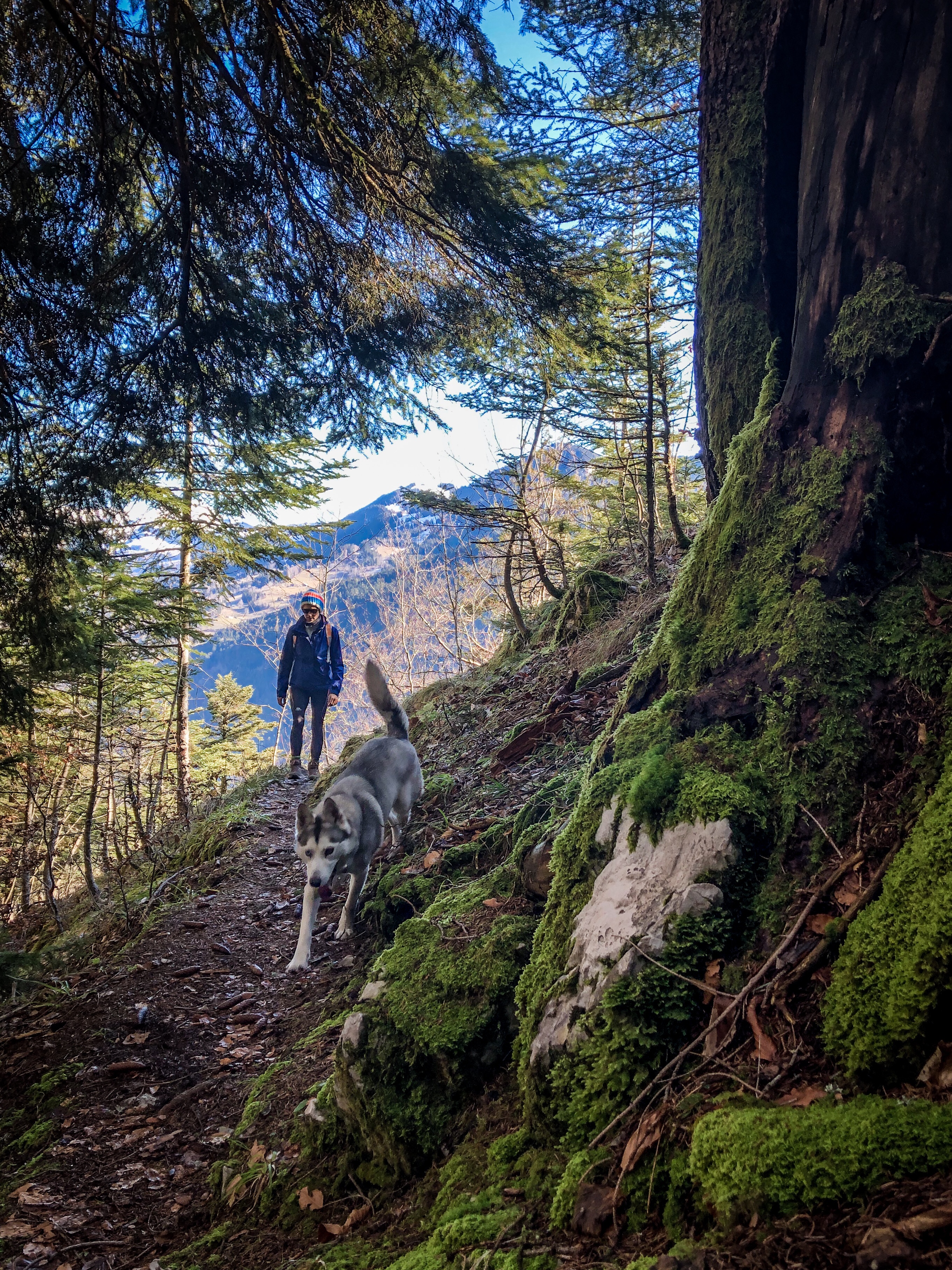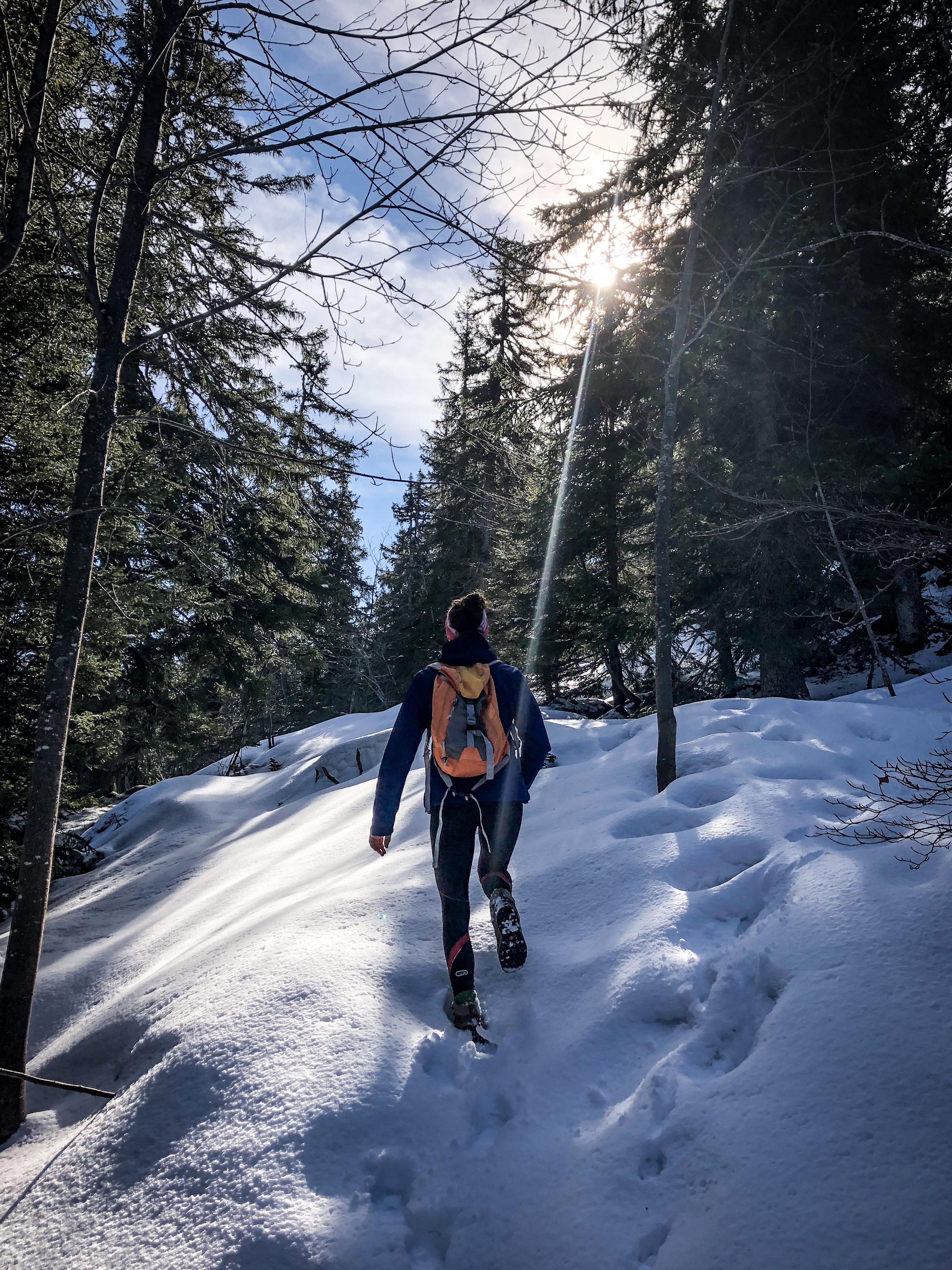 D’abord une petite route, et très rapidement un sentier prend le relais. Inutile de vous dire que ça grimpe ! La neige nous attendait à mi-hauteur et ça faisait plaisir de retrouver un paysage hivernal.