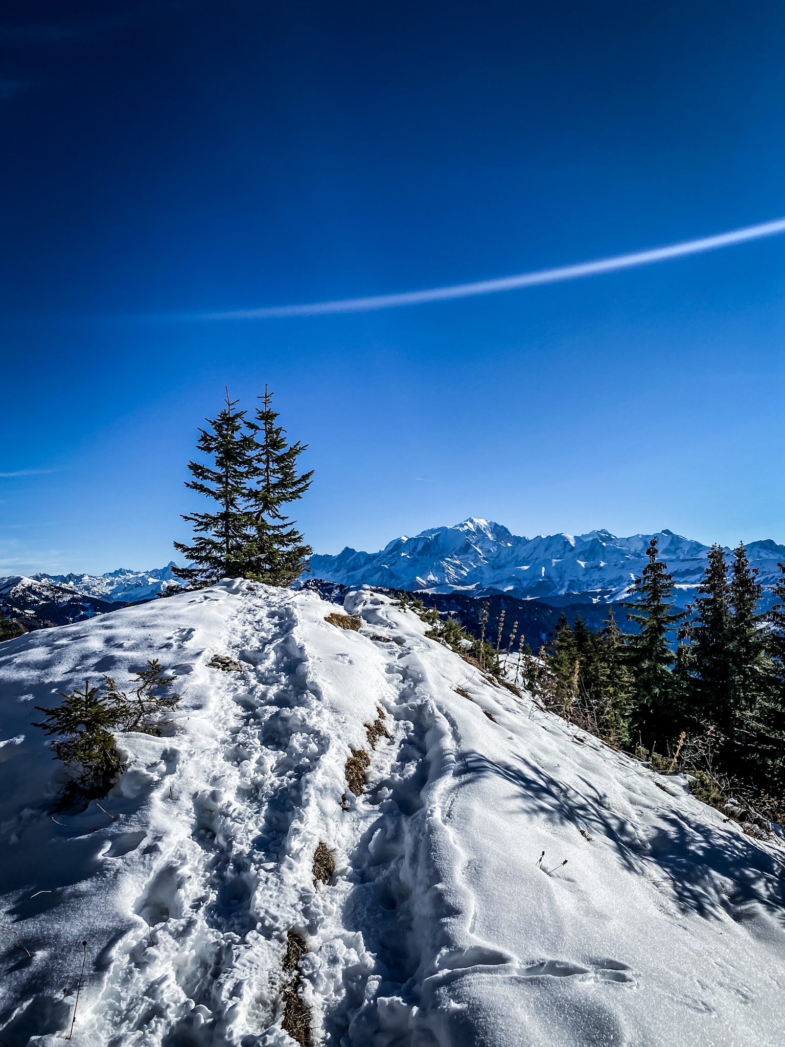 J’ai donc profité d’un beau dimanche matin pour chausser mes Hoka Speedgoat 4 GTX et enfiler mon nouveau collant Craft. Objectif : voir ce que ça donne sur neige et profiter tranquillement de la vue sur le Mont Blanc depuis le versant savoyard du col des Aravis.